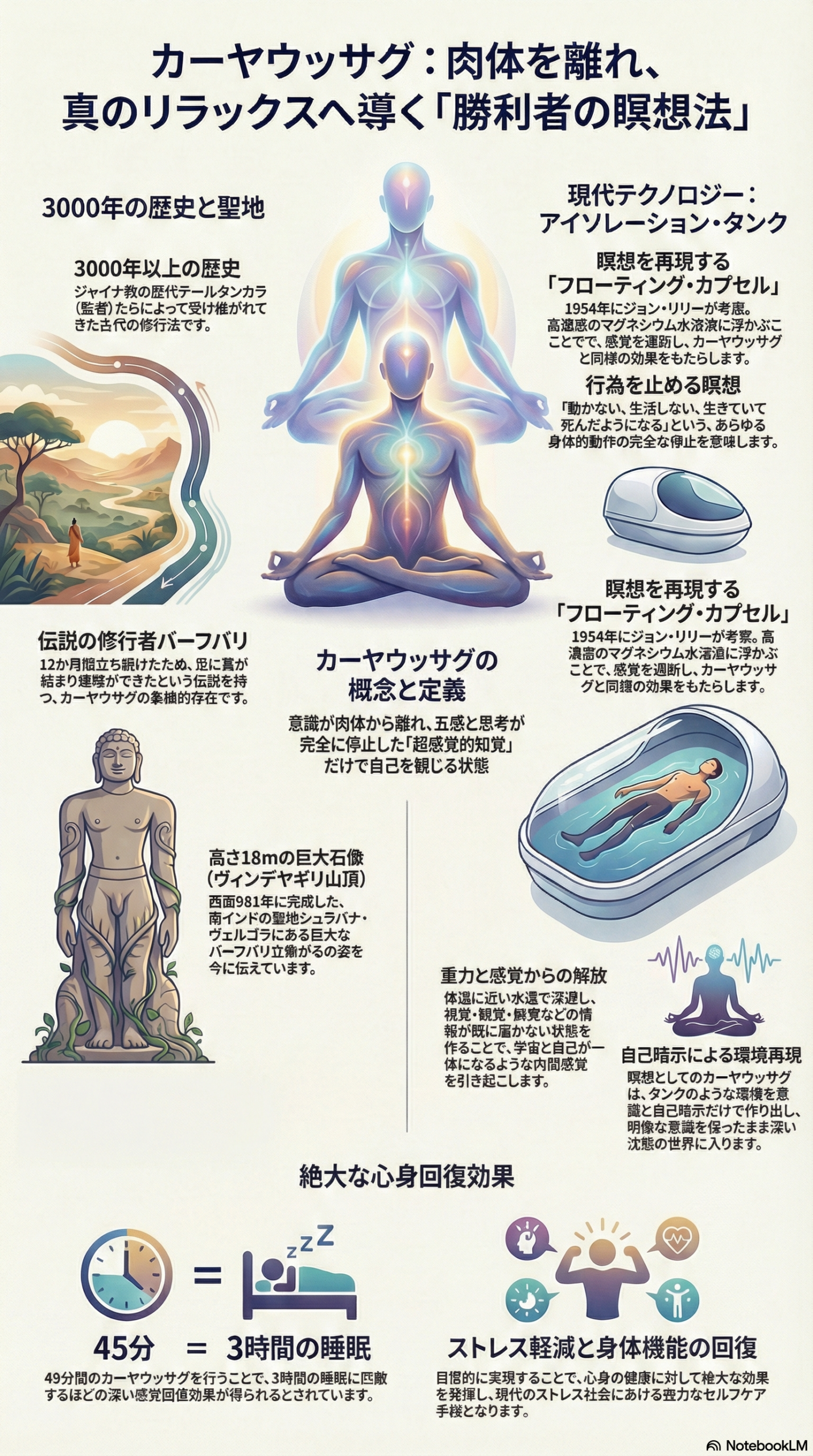 カーヤウッサグの歴史は非常に古く、3000年以上の昔まで遡ることができます。ジャイナ教の24代、最後のテールタンカラは2600年ほど前のマハーヴィーラであり、23代が2800年ほど前に歴史上実在の人物とされるパルシュヴァナータです。初代のテールタンカラはリシュバ・アディナータとされています。その息子であったゴーマテシュワーラ・バーフバリはカーヤウッサグを修行していたと伝説されています。