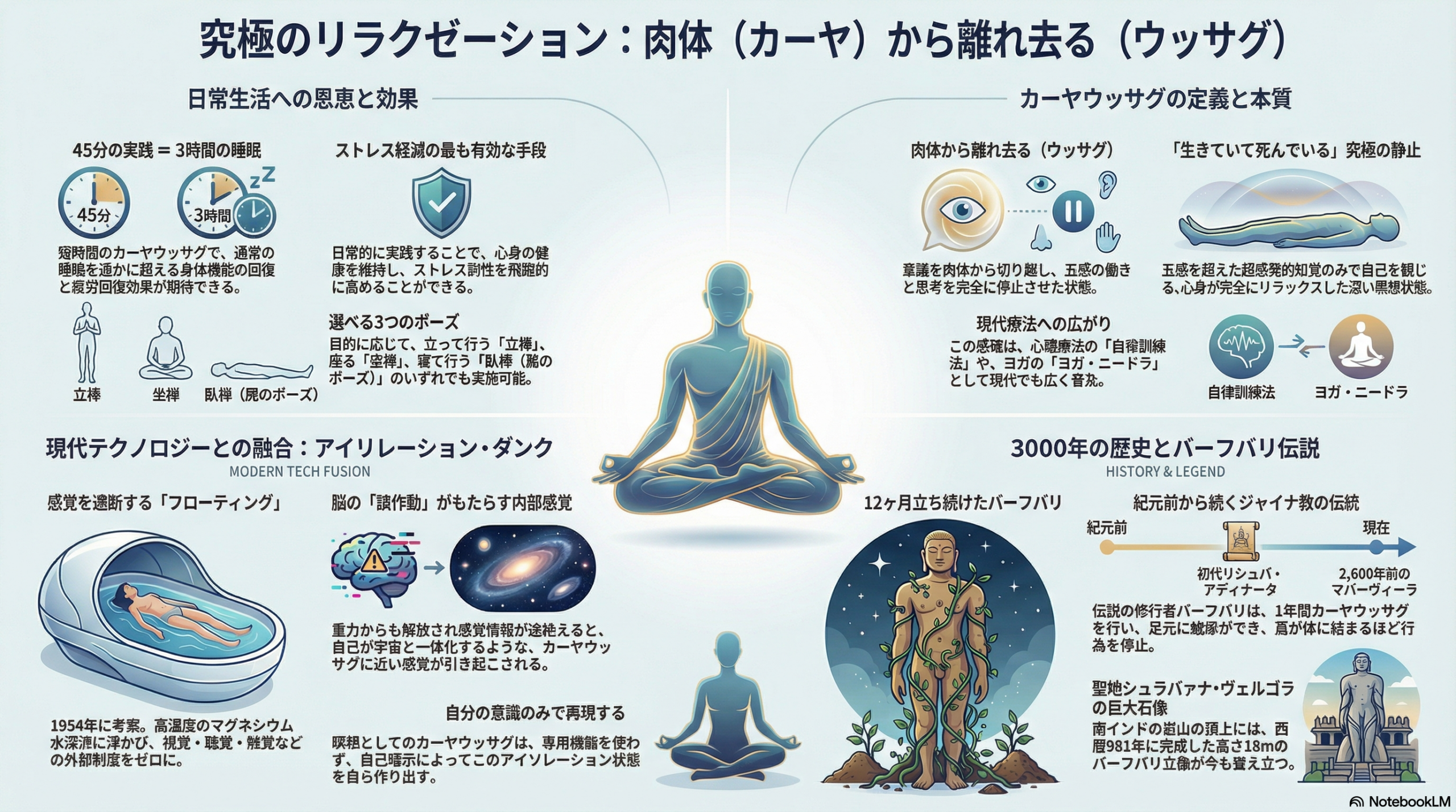 生きていて死んでいるような肉体の状態になった時、完全なる心身のリラックス状態が訪れます。カーヤウッサグの実習は日常のストレスを軽減する最も有効な手段です。この方法を応用したのが心理療法の自律訓練法であり、瞑想法の一つとしてヨガ・ニードラとして広まっています。完全なるリラクゼーション瞑想、それがカーヤウッサグです。