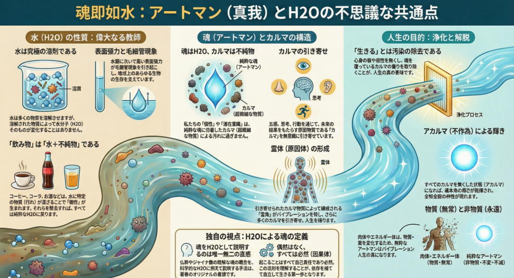私達のアートマン・魂はH2Oに似た機能を持っている。私達は生きているので、必ず生活し行動・行為している。私達が行為するとき、知ってか知らずか無意識的に自動的に、未来に何らかの結果をもたらすであろう原因物質であるカルマを、体の超微細なレヴェルに引き寄せている。原因物質である超微細なカルマ物質を、私達は五感を通して思考を通して行動を通して引き寄せている。その引き寄せられた超微細な原因物質によって出来上がった霊体が、さらにヴァイブレーションを発して、いろいろなカルマ物質が引き寄せられる。霊体は別名、原因体と云うが、そこに付着しているカルマによって、私達の人生が操られているからである。それが因果律、原因と結果の法則、カルマの法則なのである。霊体の汚れが個性であり、潜在意識であり、癖付いた心である。
