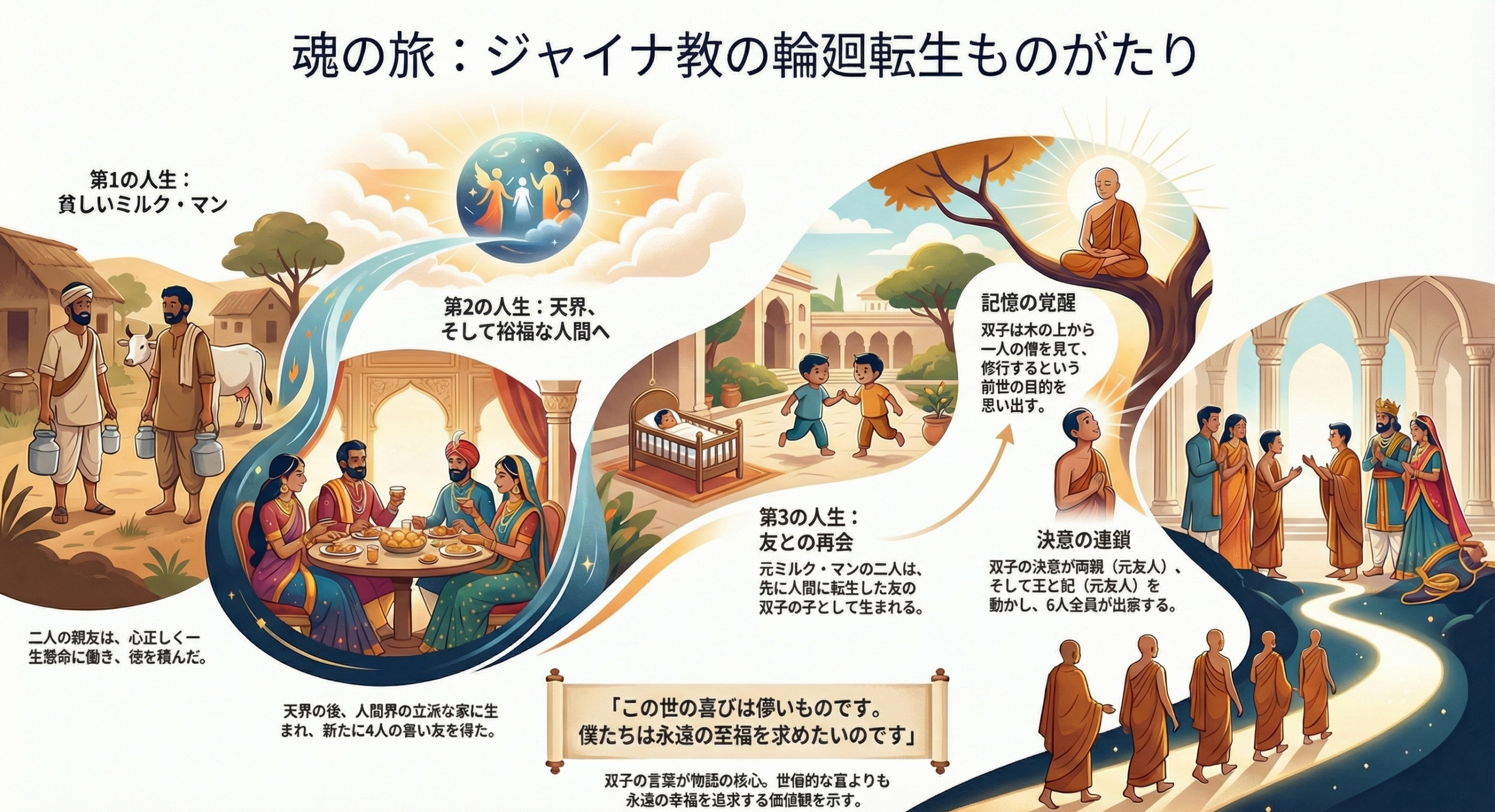 天人として生きた後、4人は人間界に戻り、ある国の王とその妃、その国の裕福な商人とその妻になりました。4人は平和に暮らしていましたが、商人夫妻は子供が無いことを残念に思っていました。一方、天界に残っていた元ミルク・マンたちも人間界で修行をしたくなってきたので、旧友たちの子に生まれることにしました。